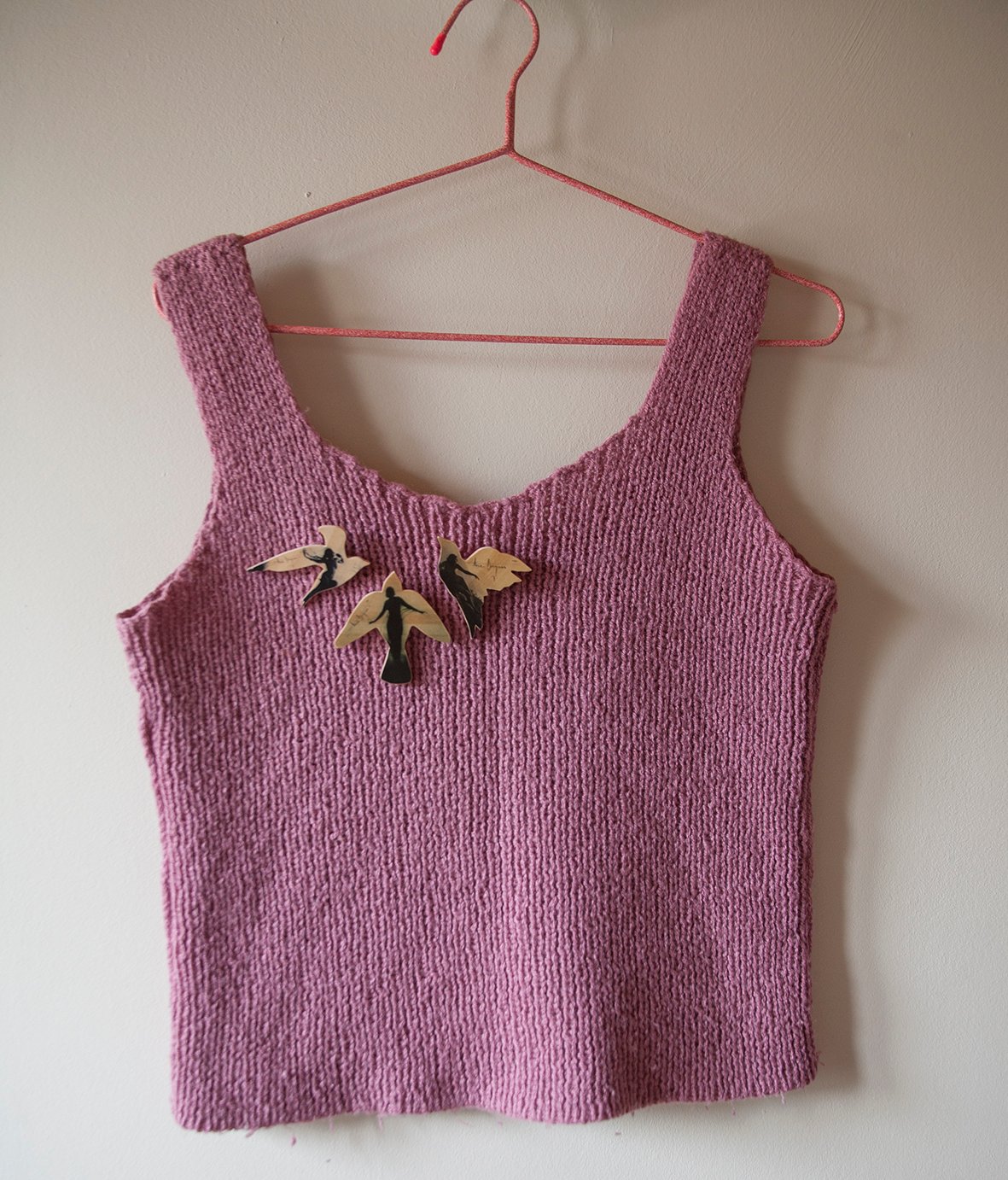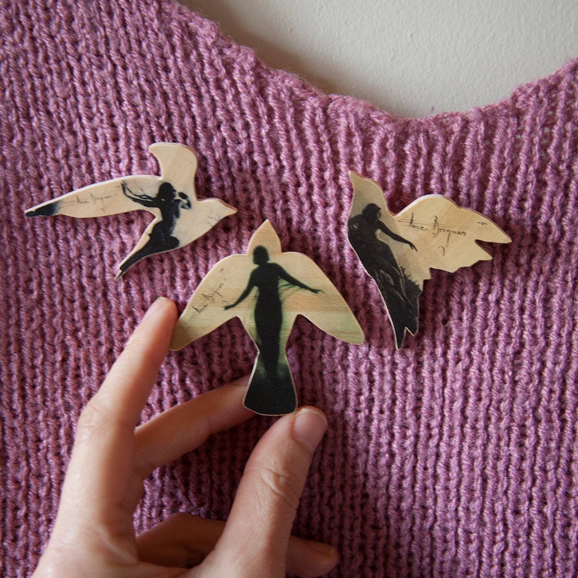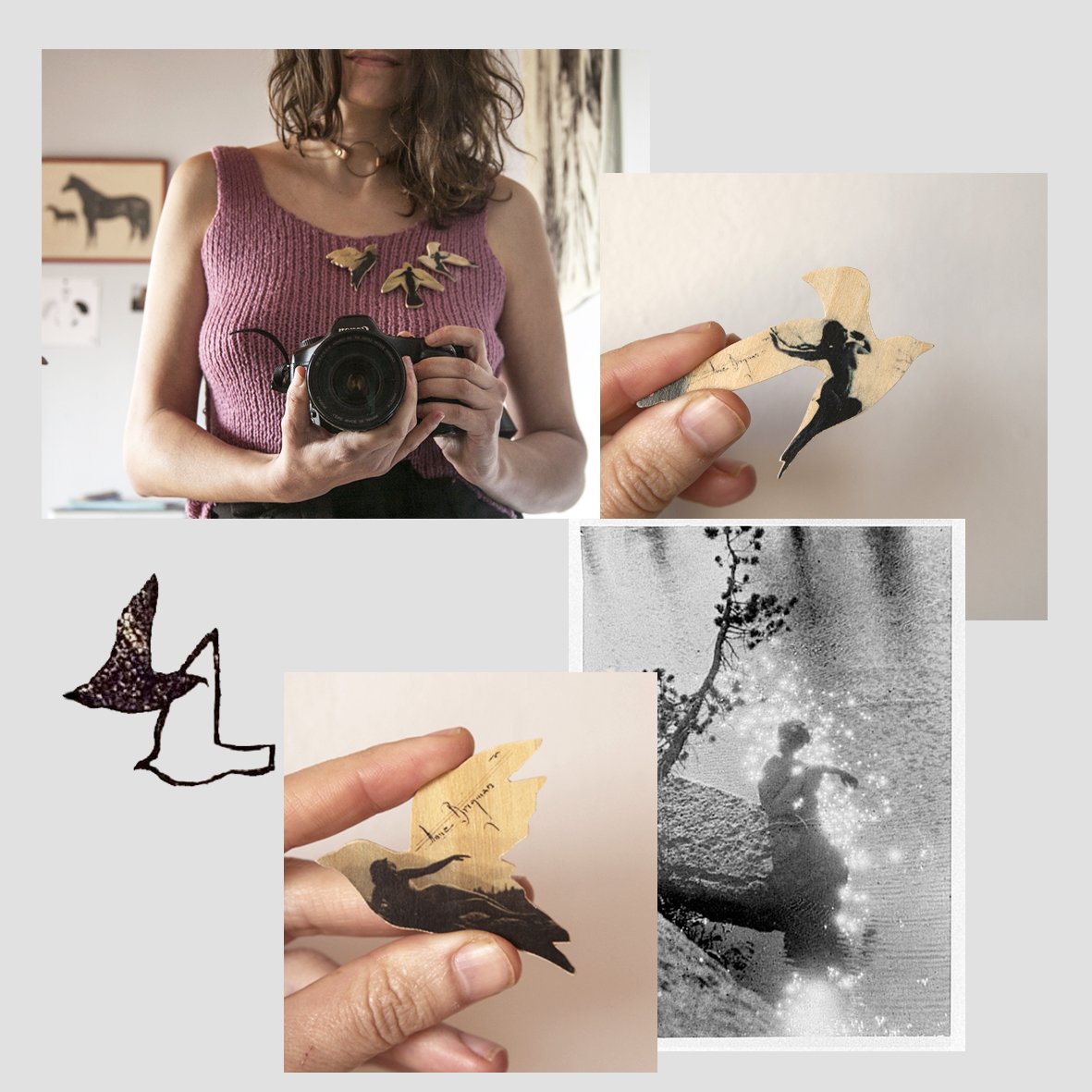 ¡Qué sorpresa me llevé cuando descubrí algo que no había percibido al diseñarlos!: decidí poner la firma de la fotógrafa en el último momento porque me parecía que era importante. Por fin di con ella después de buscar un buen rato por el ancho internet y la añadí a los diseños. Cuando ya estaba montando los broches, me fijé en una pequeña línea en la parte superior de esa firma, ¡tenía forma de pájaro!