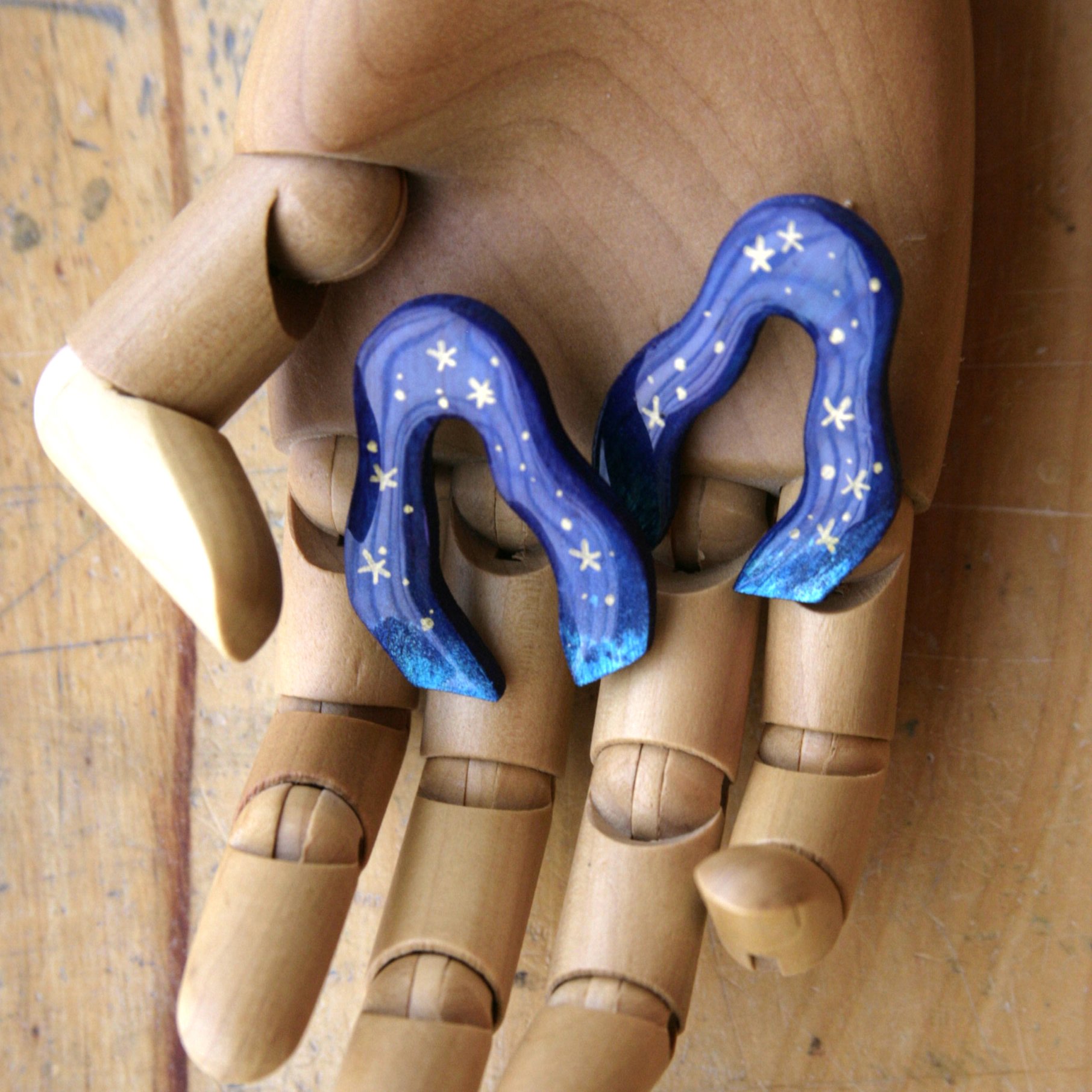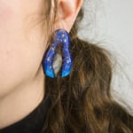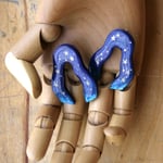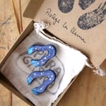Los pendientes Río Noche son llamativos y preciosos: un azul firmamento intenso inspirado en los Jardines Majorelle con los extremos en turquesa contrastan con las estrellas pintadas en dorado. Son muy ligeros y cómodos. Cubiertos de resina para dar ese brillo que consigue que los azules destaquen aún más y te hagan recordar las aguas de un río.
