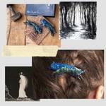 Dos pinzas para el pelo llenas de detalles, bordes pintados de negro, detalles en azul y dorado pintados a mano y una capa protectora de resina.