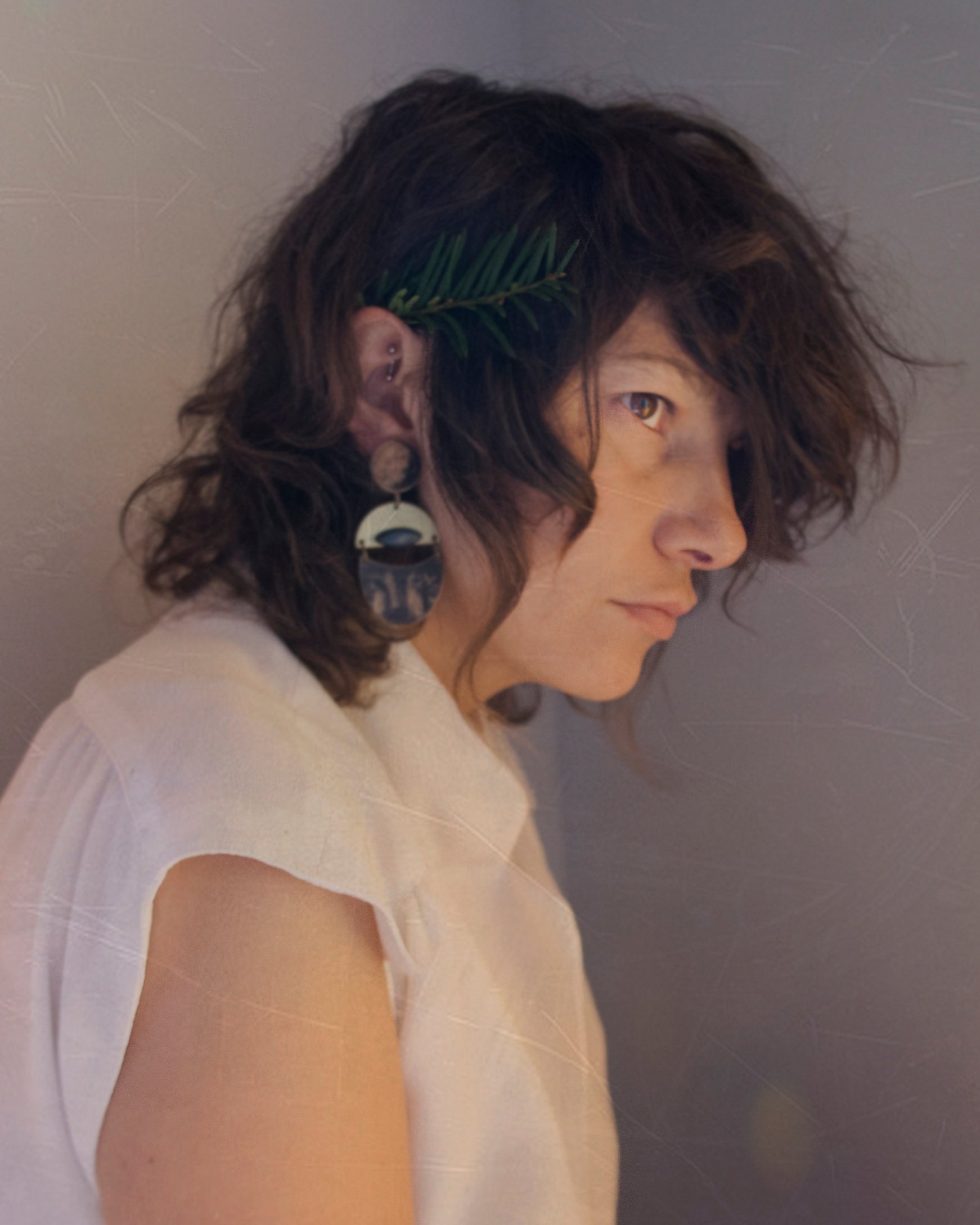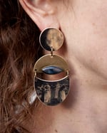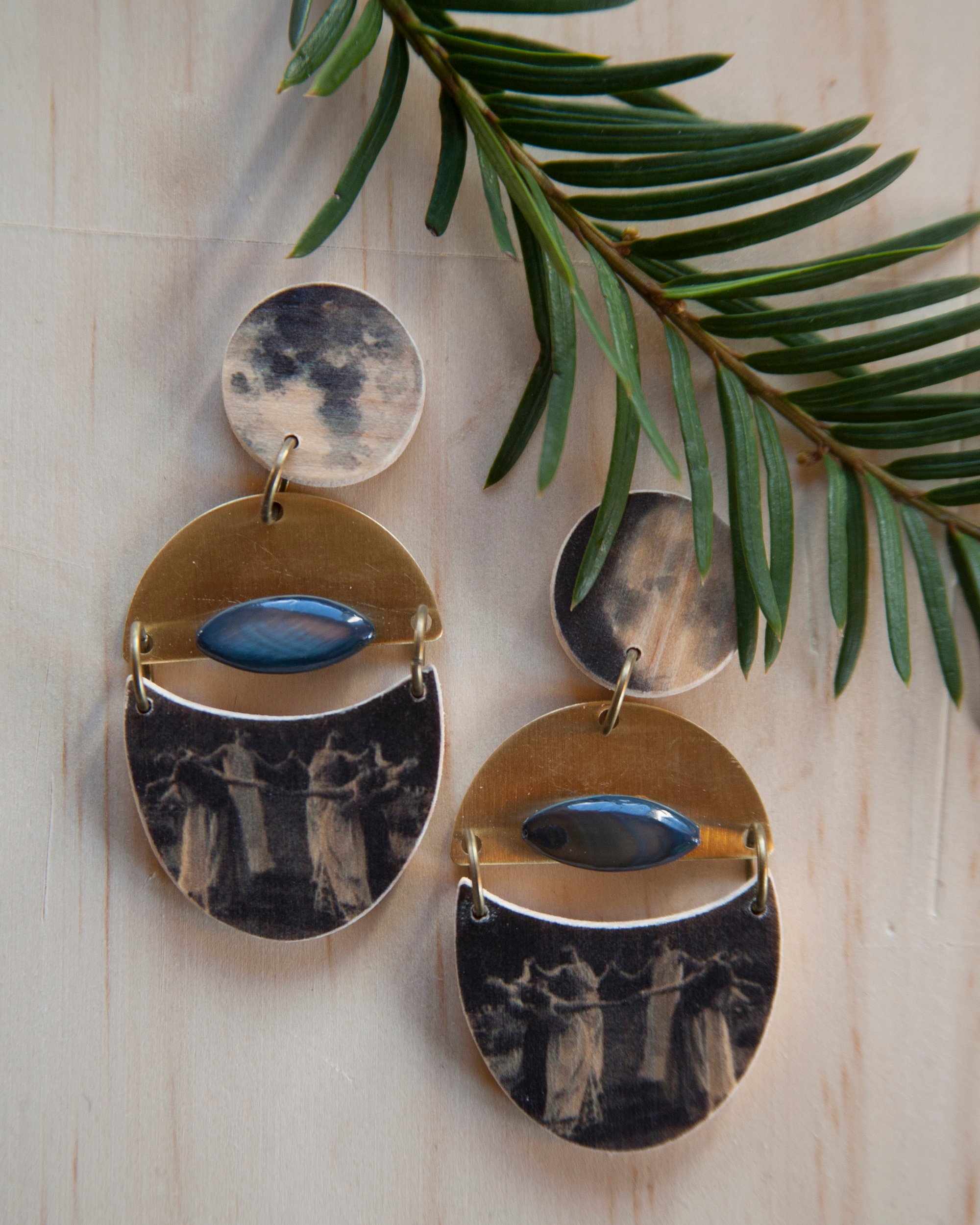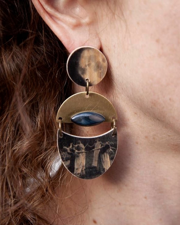 Pendientes de madera con antigua fotografía de círculo de mujeres bailando a la luna. La pieza dorada es de latón. Lleva pegada una cuenta de nácar color gris azulado. Todas las piezas de madera están cortadas, lijadas y barnizadas a mano.