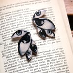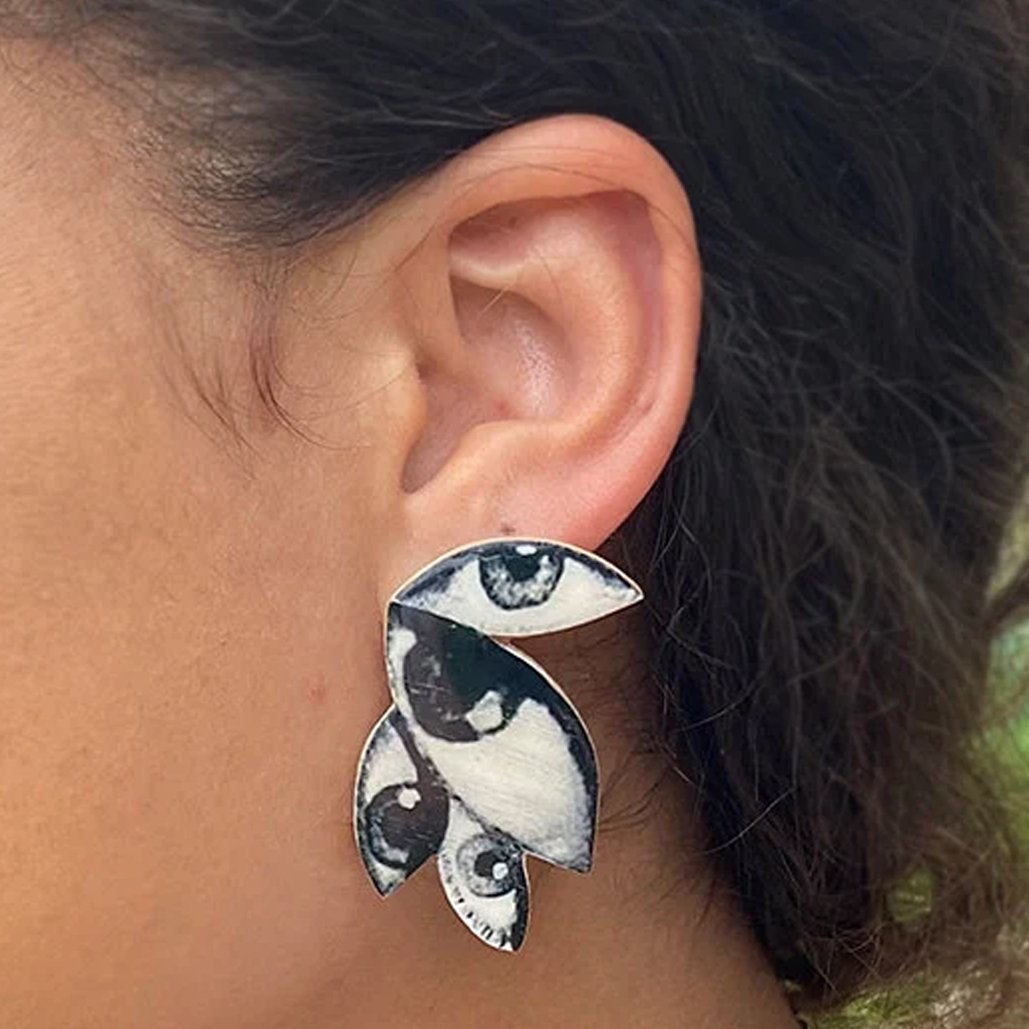 Pendientes de madera con capa de resina. Se trata de un diseño hecho con fotografías antiguas de ojos. El palillo y la tuerca es de plata.
