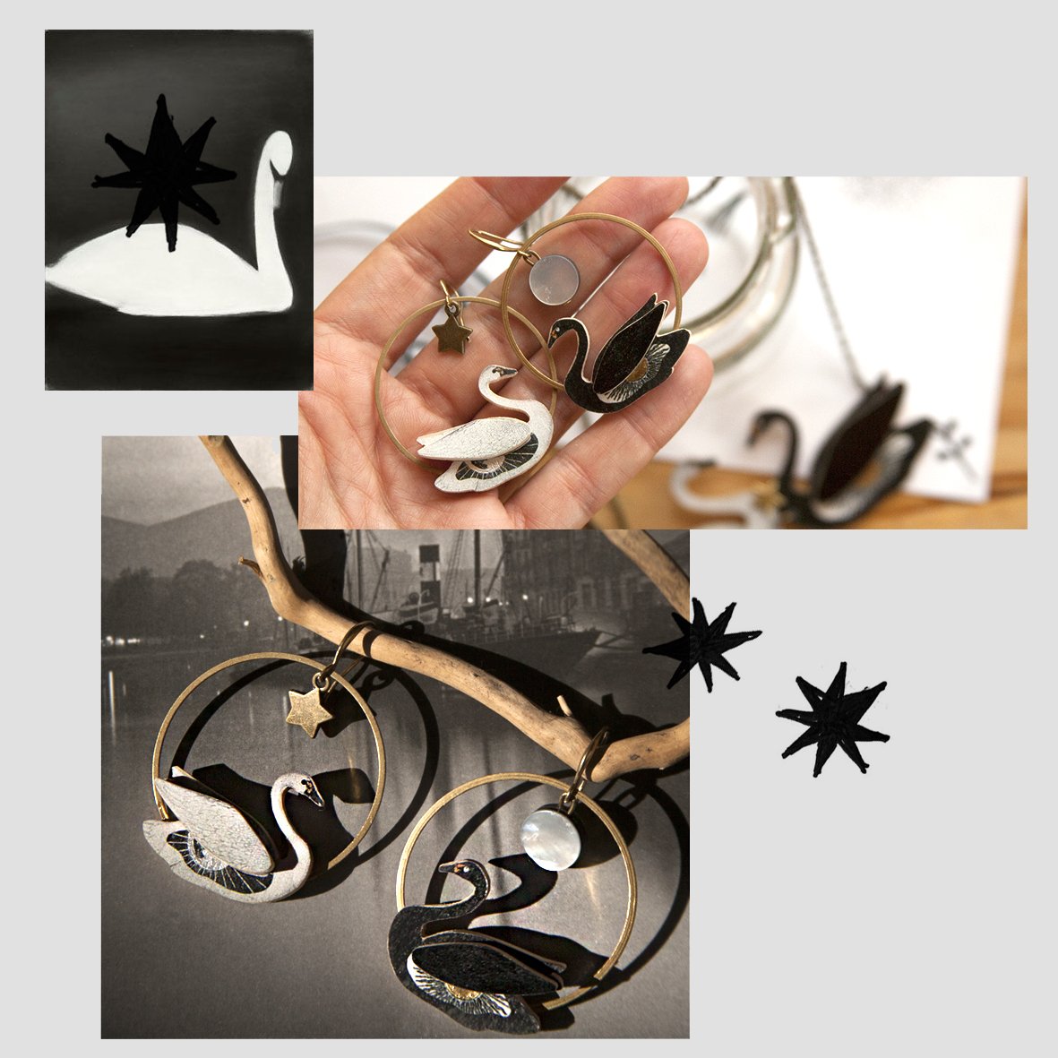 Decorados con detalles pintados a mano en oro y plata. Nácar, aro y gancho de latón, corte manual.